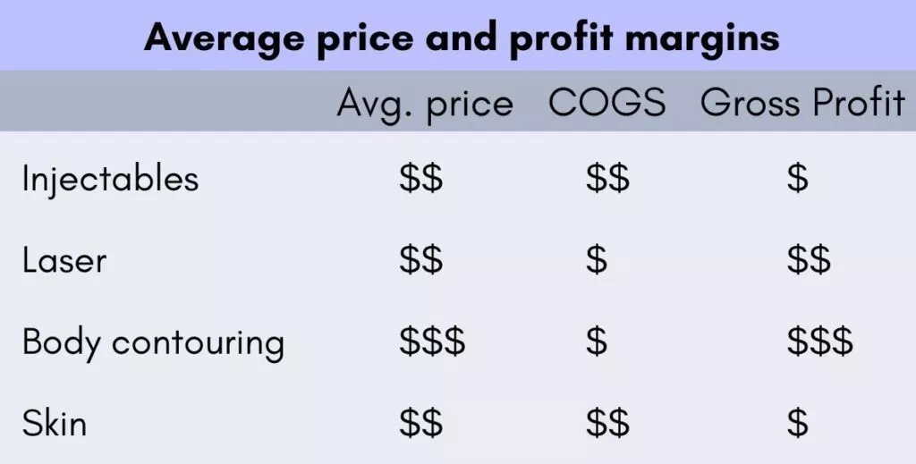 You need to create the right mix of services (as you can see in the chart) for your practice. Let’s say if you’re a plastic surgeon maybe you’re doing body contouring procedures, surgical procedures, and maybe that’s what you’re doing a lot – mix that with laser and injectables and some skin treatments and maybe include retail if you’re doing it. Create that correct or a healthy mix of services by taking into consideration the profit you will earn from it.